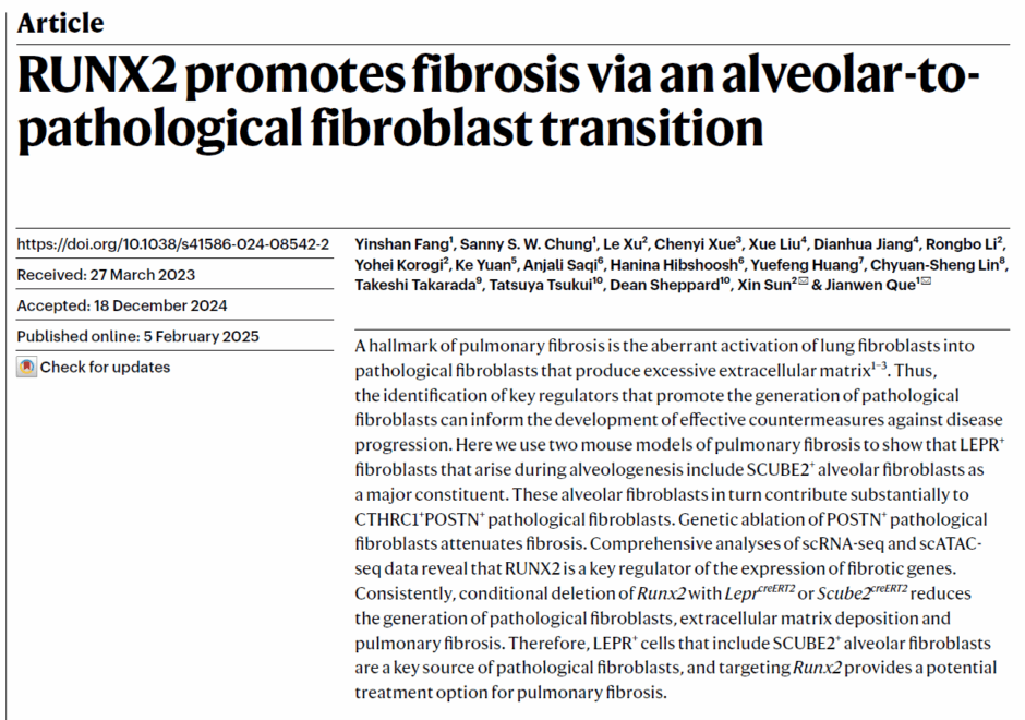 Yinshan Fang, Sanny S. W. Chung, Le Xu, Chenyi Xue, Xue Liu, Dianhua Jiang, Rongbo Li, Yohei Korogi, Ke Yuan, Anjali Saqi, Hanina Hibshoosh, Yuefeng Huang, Chyuan-Sheng Lin, Takeshi Takarada, Tatsuya Tsukui, Dean Sheppard, Xin Sun, Jianwen Que. RUNX2 promotes fibrosis via an alveolar-to-pathological fibroblast transition. Nature,640, 221–230.