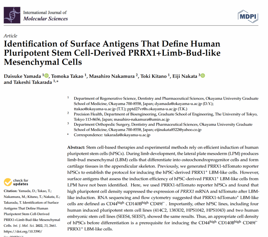 Daisuke Yamada, Tomoka Takao, Masahiro Nakamura, Toki Kitano, Eiji Nakata, Takeshi Takarada (corresponding author). Identification of Surface Antigens That Define Human Pluripotent Stem Cell-Derived PRRX1+Limb-Bud-like Mesenchymal Cells. Int. J. Mol. Sci. 2022, 23(5), 2661; doi: 10.3390/ijms23052661.