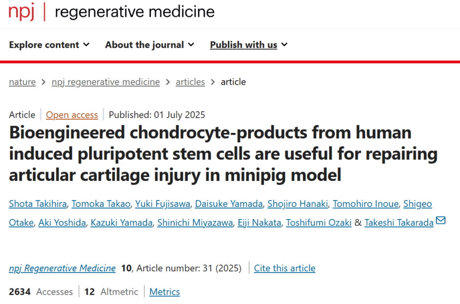 Shota Takihira, Tomoka Takao, Yuki Fujisawa, Daisuke Yamada, Shojiro Hanaki, Tomohiro Inoue, Shigeo Otake, Aki Yoshida, Kazuki Yamada, Shinichi Miyazawa, Eiji Nakata, Toshifumi Ozaki, Takeshi Takarada (corresponding author). Bioengineered chondrocyte-products from human induced pluripotent stem cells are useful for repairing articular cartilage injury in minipig model. npj Regenerative Medicine, 2025, 10: 31. doi: 10.1038/s41536-025-00420-3.