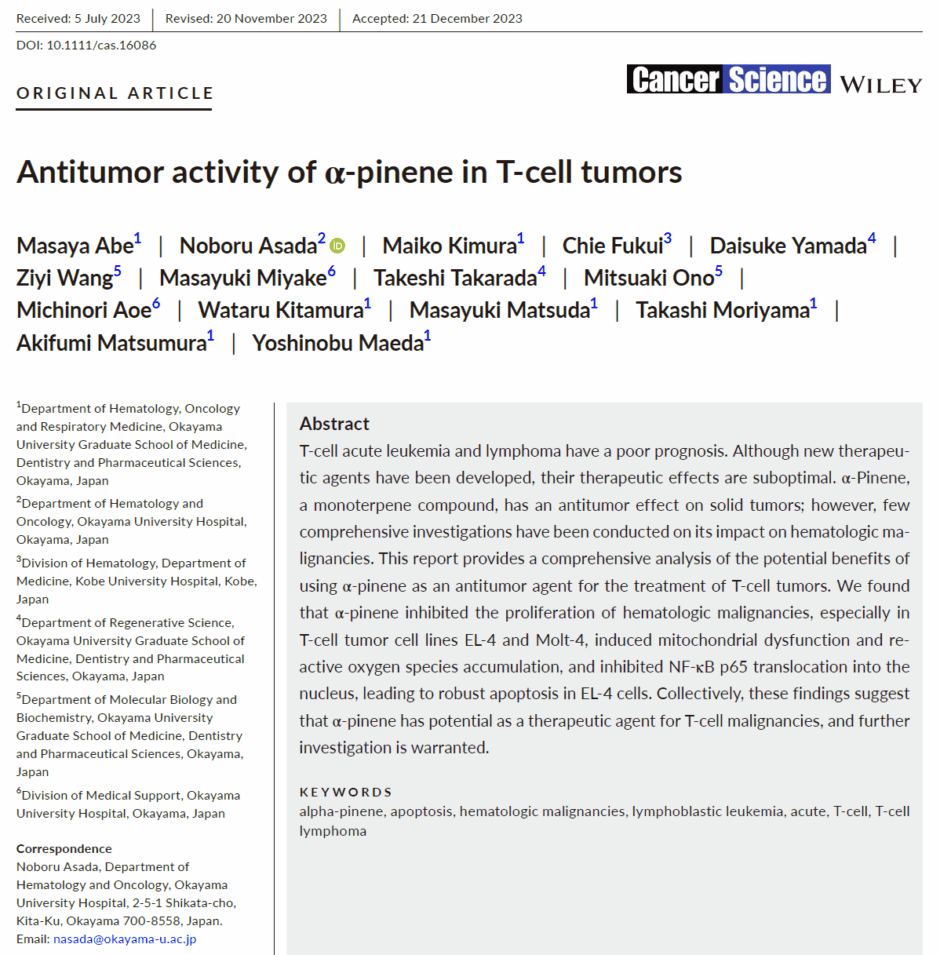 Masaya Abe, Noboru Asada, Maiko Kimura, Chie Fukui, Daisuke Yamada, Ziyi Wang, Masayuki Miyake, Takeshi Takarada, Mitsuaki Ono, Michinori Aoe, Wataru Kitamura, Masayuki Matsuda, Takashi Moriyama, Akifumi Matsumura, Yoshinobu Maeda. Antitumor activity of α-pinene in T-cell tumors. Cancer Science, 2024, 115(4):1317-1332. doi: 10.1111/cas.16086.