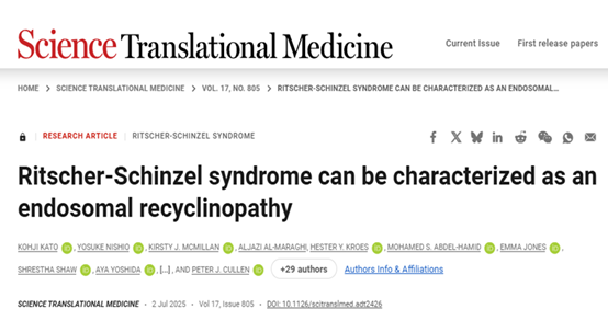 Kato, K., Nishio, Y., McMillan, K.J., Al-Maraghi, A., Kroes, H.Y., Abdel-Hamid, M.S., Jones, E., Shaw, S., Yoshida, A., Otsuji, S., Murofushi, Y., Aamer, W., Bhat, A.A., AlRayahi, J., Al-Shabeeb Akil, A.S., Aliyev, E., van Binsbergen, E., Janssen, E.J., Mehrin, K.M., Oishi, H., Kobayashi, R., Horii, T., Hatada, I., Saito, A., Hattori, M., Kawano, Y., Lewis, P.A., Heesom, K.J., Takarada, T., Sawamoto, K., Matsushita, M., Ogi, T., Butkovic, R., Danson, C., Wilkinson, K.A., Fakhro, K.A., Zaki, M.S., Saitoh, S., and Cullen, P.J. (2025). Ritscher-Schinzel syndrome can be characterized as an endosomal recyclinopathy. Sci. Transl. Med. 17, eadt2426.